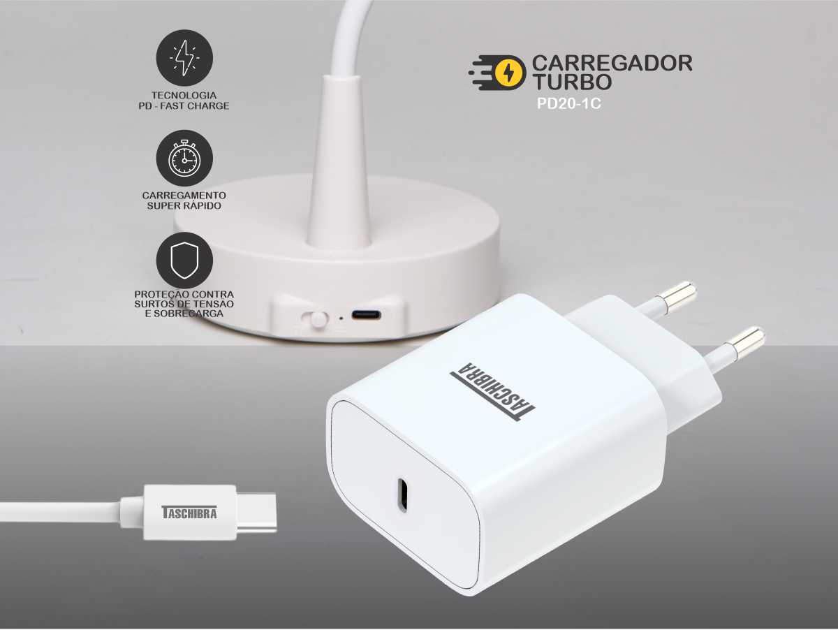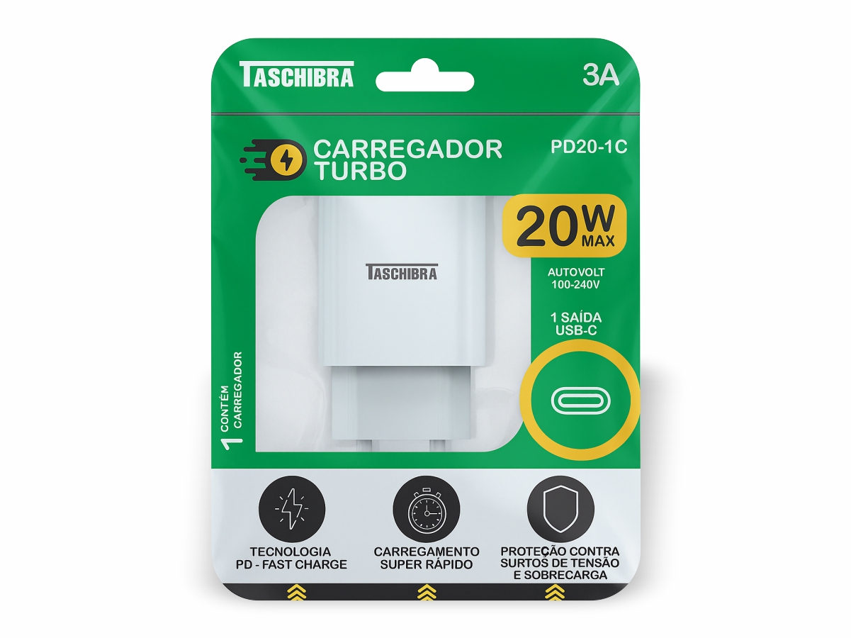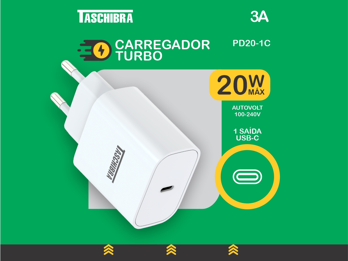 CARREGADOR TURBO USB TASCHIBRA PARA ELETRONICOS PD20-1C 20W AUTOVOLT