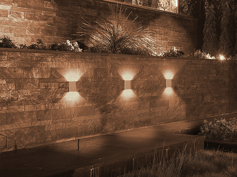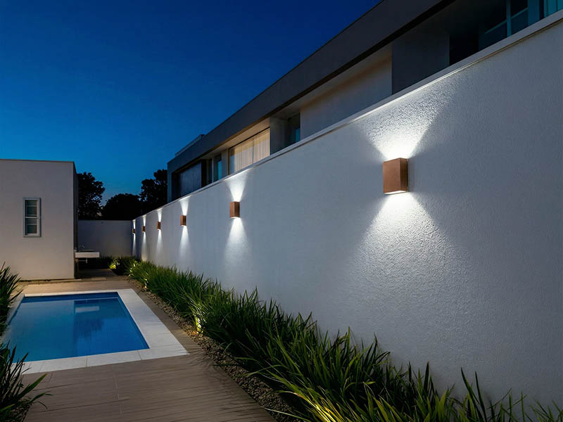 • Características: Efeito de luz com facho duplo. LED integrado, ideal para uso externo em fachadas, muros e áreas de lazer.
