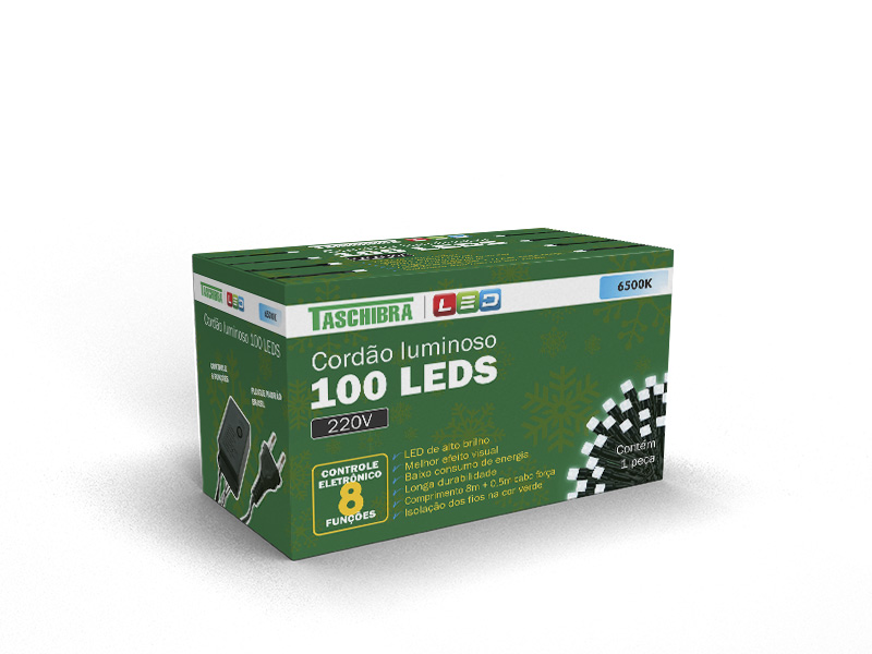 CORDÃO LUMINOSO TASCHIBRA 100 LEDS 8 FUNÇÕES ISOL VD 220V 6500K