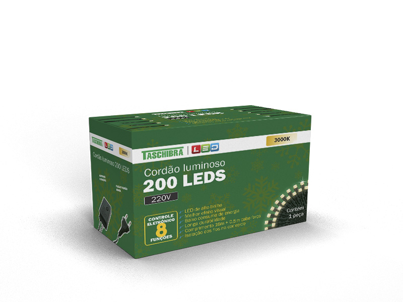 CORDÃO LUMINOSO TASCHIBRA 200 LEDS 8 FUNÇÕES ISOL VD 220V 3000K