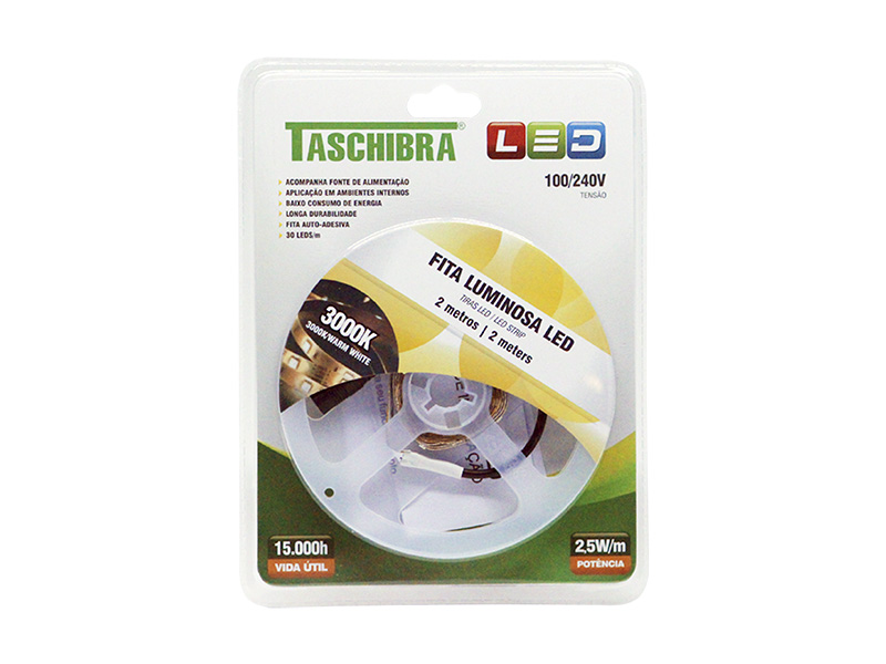 FITA LED 2,5W 30 LEDS/M 2M 12V COM FONTE AUTOVOLT IP20 3000K