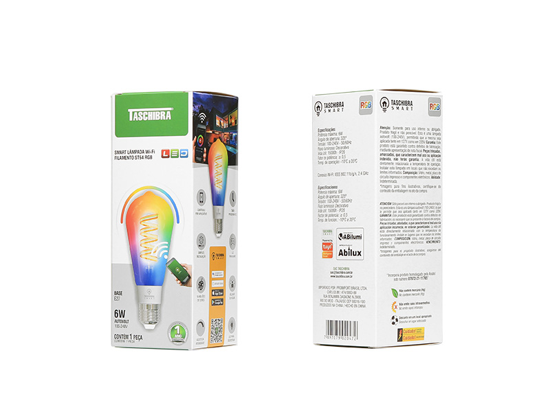Características: Instale várias unidades e controle pelo mesmo aplicativo Taschibra. 16 milhões de cores, ajuste de intensidade, timer programável, luz para game, relaxar ou focar, luz para despertar.