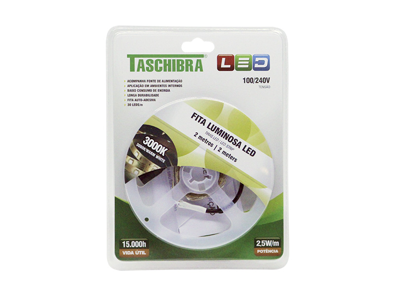FITA LED 2,5W 30 LEDS/M 2M 12V COM FONTE AUTOVOLT IP20 3000K